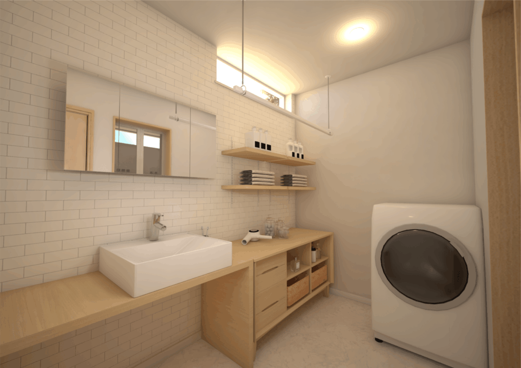 ●洗面脱衣所は広々3帖!物干しや大容量の造作収納完備で使い勝手抜群!