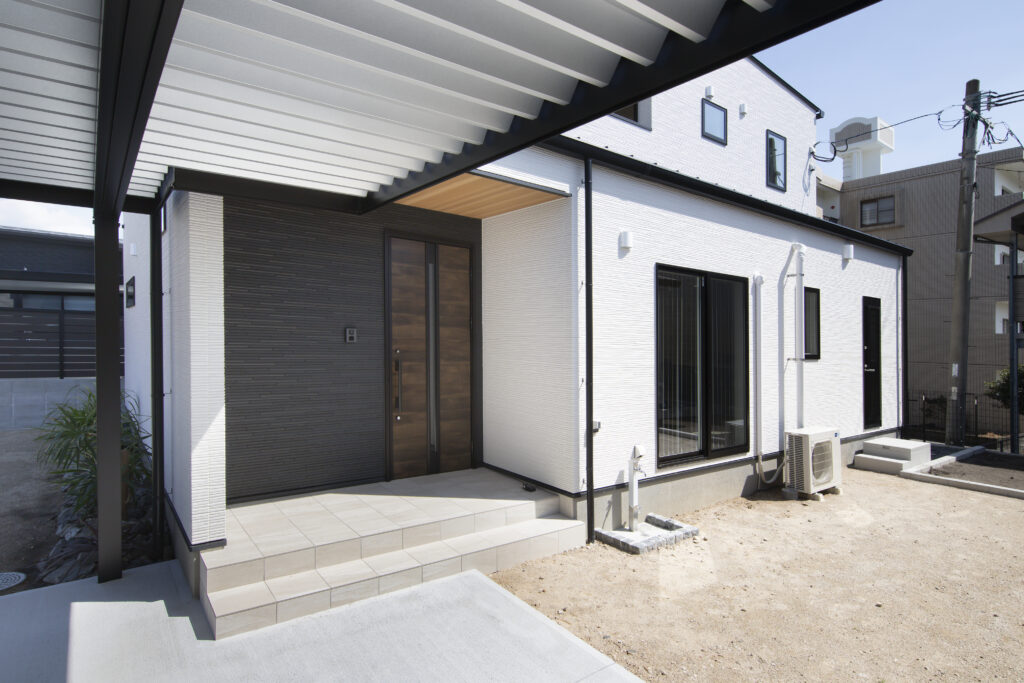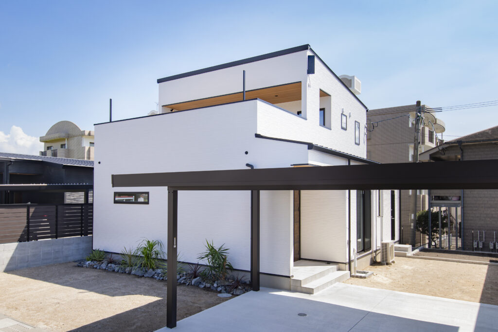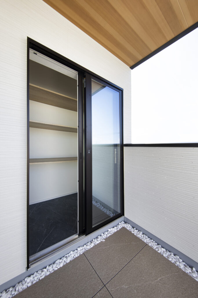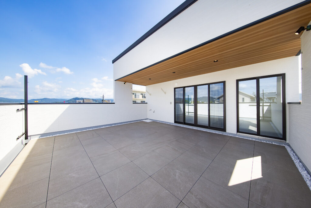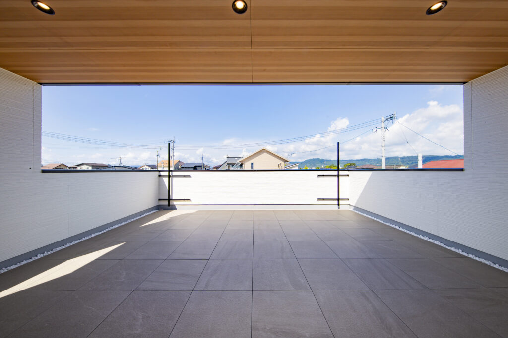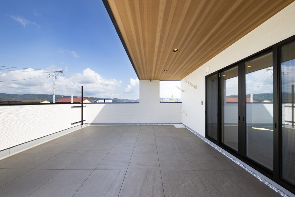 2階に広がる、軒付きプライベートバルコニー。